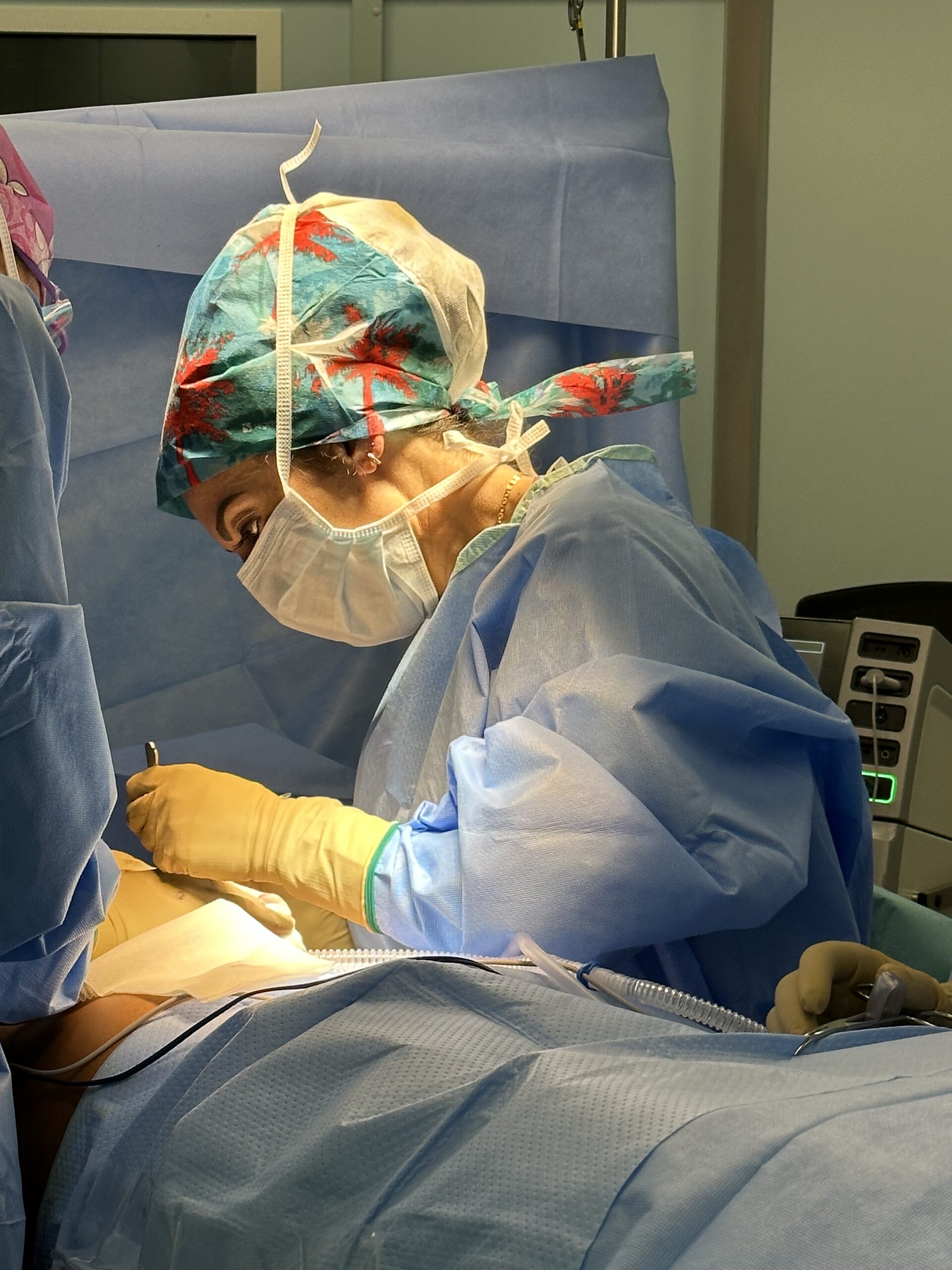 - Incision stratégique : Je pratique une incision horizontale dans la partie basse de l’abdomen, généralement située juste au-dessus du pubis et s’étendant d’une hanche à l’autre. Son emplacement précis est soigneusement calculé pour que la future cicatrice puisse être dissimulée sous les sous-vêtements ou un maillot de bain. Une seconde incision circulaire est réalisée autour du nombril pour le préserver.