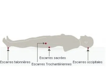 On peut distinguer différentes escarres (Sacrées, Ischiatiques, Trochantériennes, Talonnières, Occipitales) sur les images suivantes :